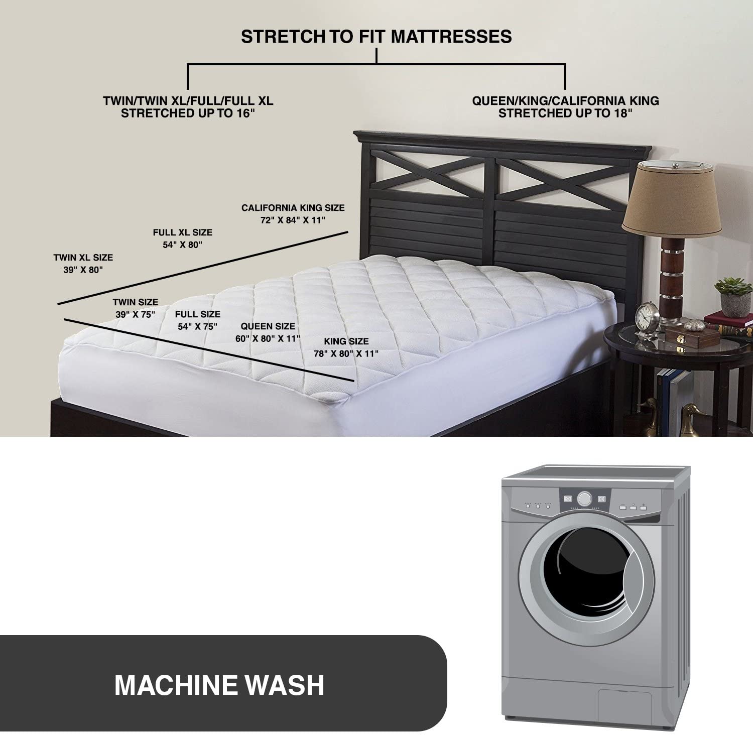 | Cal. King | 72" W x 84" L + 16" | stretch up to 18" deep |